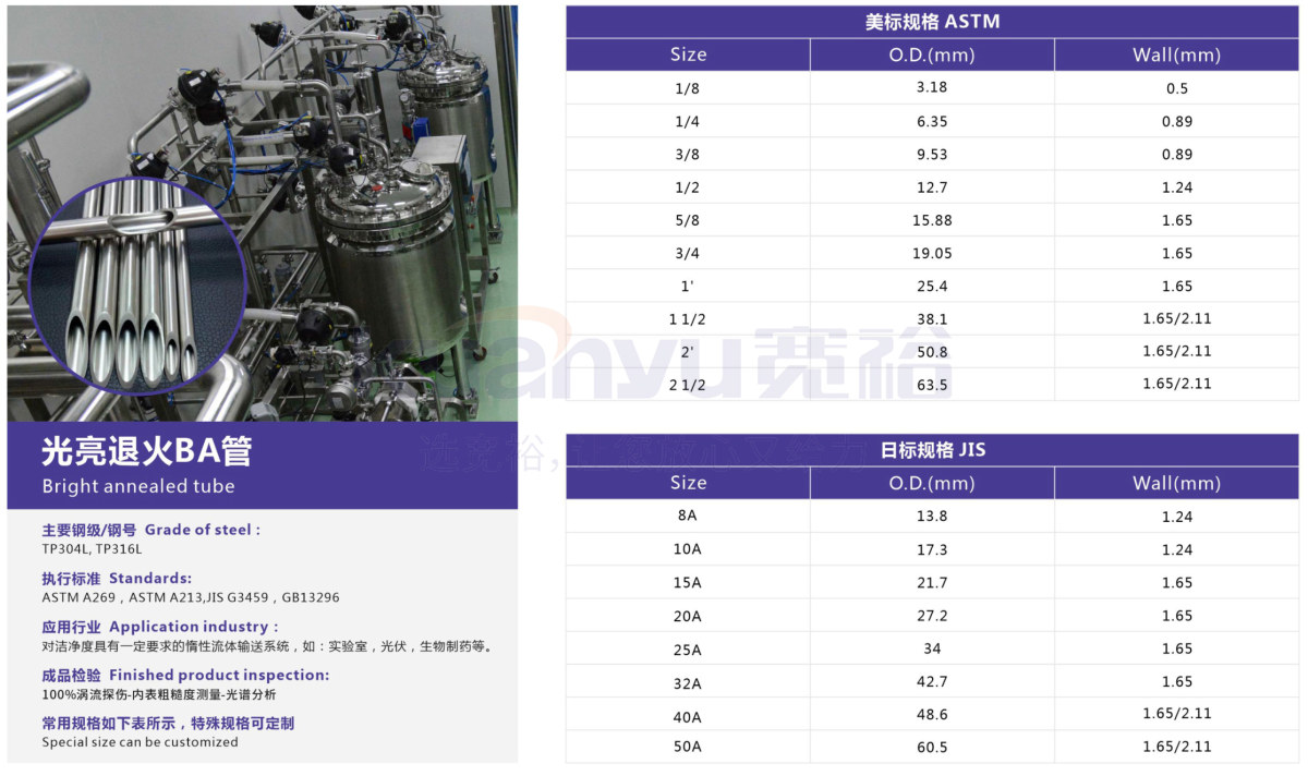 1.表面光潔度:針對(duì)鋼管的內(nèi)外表面進(jìn)行拋光處理,使得鋼管表面呈亮面;也就是我們常說(shuō)的鏡面。主要是防止管內(nèi)走的流體物質(zhì)在管內(nèi)形成掛壁,時(shí)間長(zhǎng)了容易污染而且形成管內(nèi)堵塞。