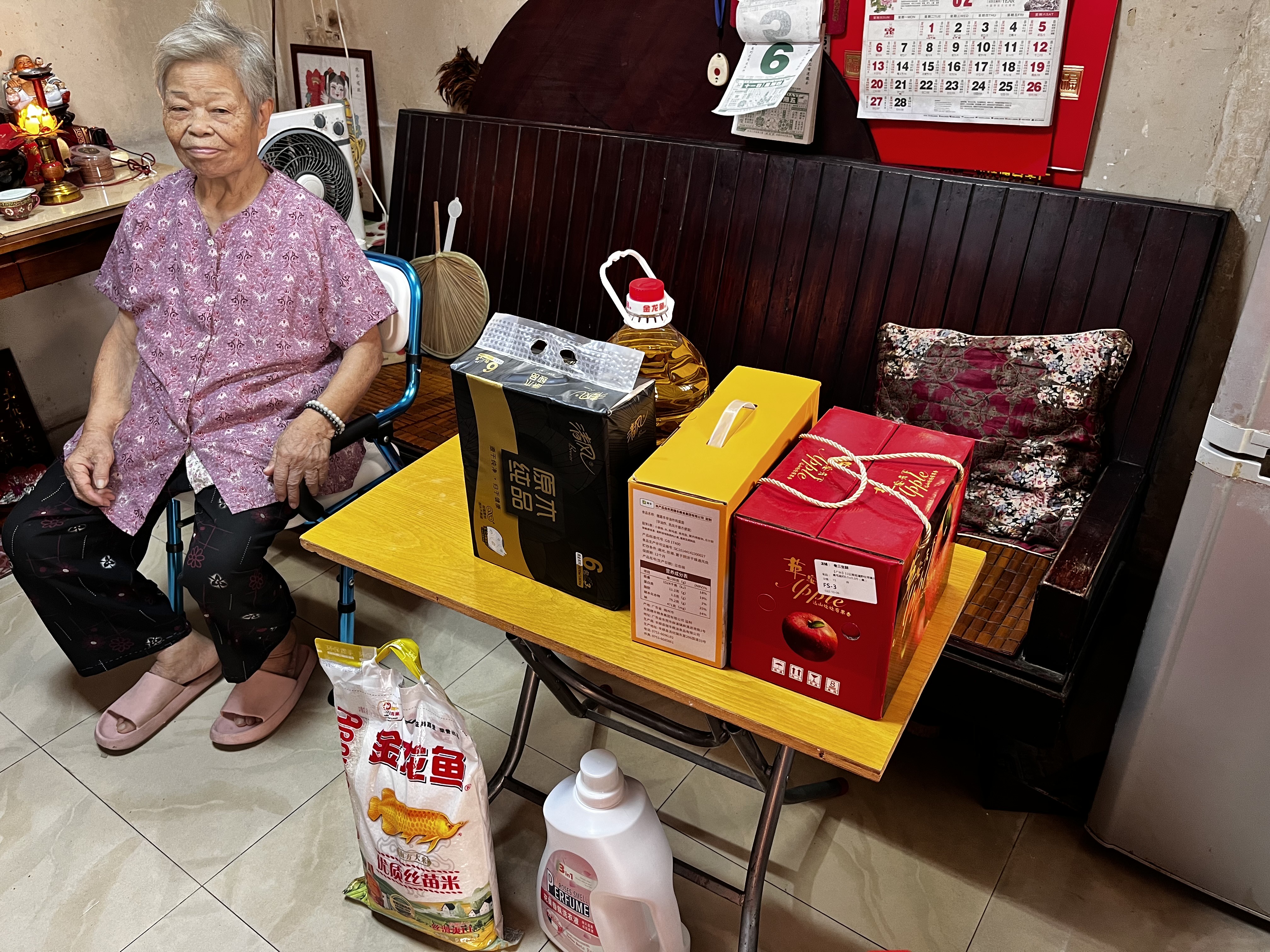 精心挑選的柴米油鹽、新鮮可口的營養果蔬、日常使用的清潔紙巾、一年分量的洗衣液……每一樣都精挑細選,為老人生活增添亮麗色彩。